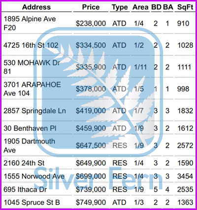 30 Benthaven Place. These condos feel more like real houses and the location is very desirable. You’ve got the best public schools in Boulder and reasonable space, plus a two car garage. This 3/2 is 1,600 SQFT and the asking is $460K. The owner paid $430 in 2011 but the unit has some updates. The HOA is $250 a month. If you want lock and leave and you’d rather not do exterior maintenance, this one is definitely worth a look.