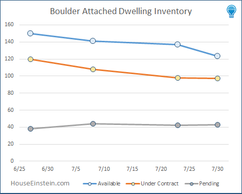 The chart above shows attached dwelling inventory (i.e. town homes and condos) in the City of Boulder from the end of June through today, July 30. The blue line is available, the orange line is under contract, and the grey line is pending.