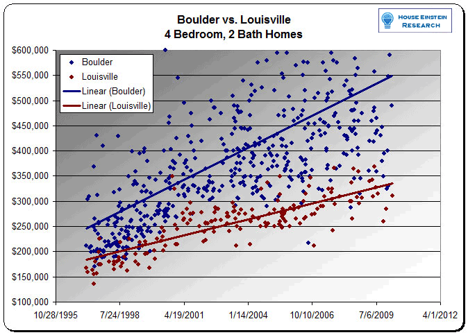 A few years ago, we helped a Doctor decide between purchasing in Boulder or Louisville by analyzing all the sold homes with 4 bedrooms and 2 bathrooms and running a regression. This is what it looked like.