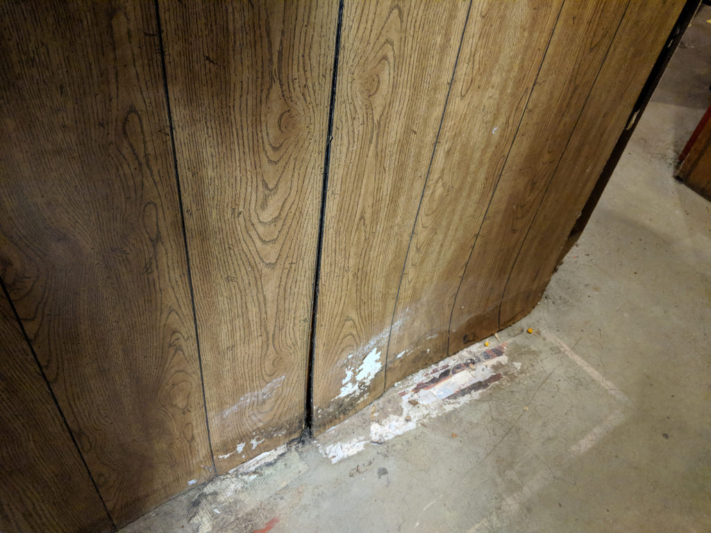 | Warped wood paneling and no flooring = flood damage |