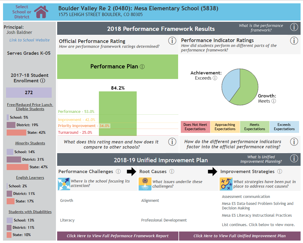 If you’re shopping in Boulder, our school district is called Boulder Valley RE 2. At the time of this writing, you can easily look up District and School Performance Frameworks and Unified Improvement Plans on the Colorado School View website. You can also learn about the district and school demographics. It’s all available by clicking HERE.