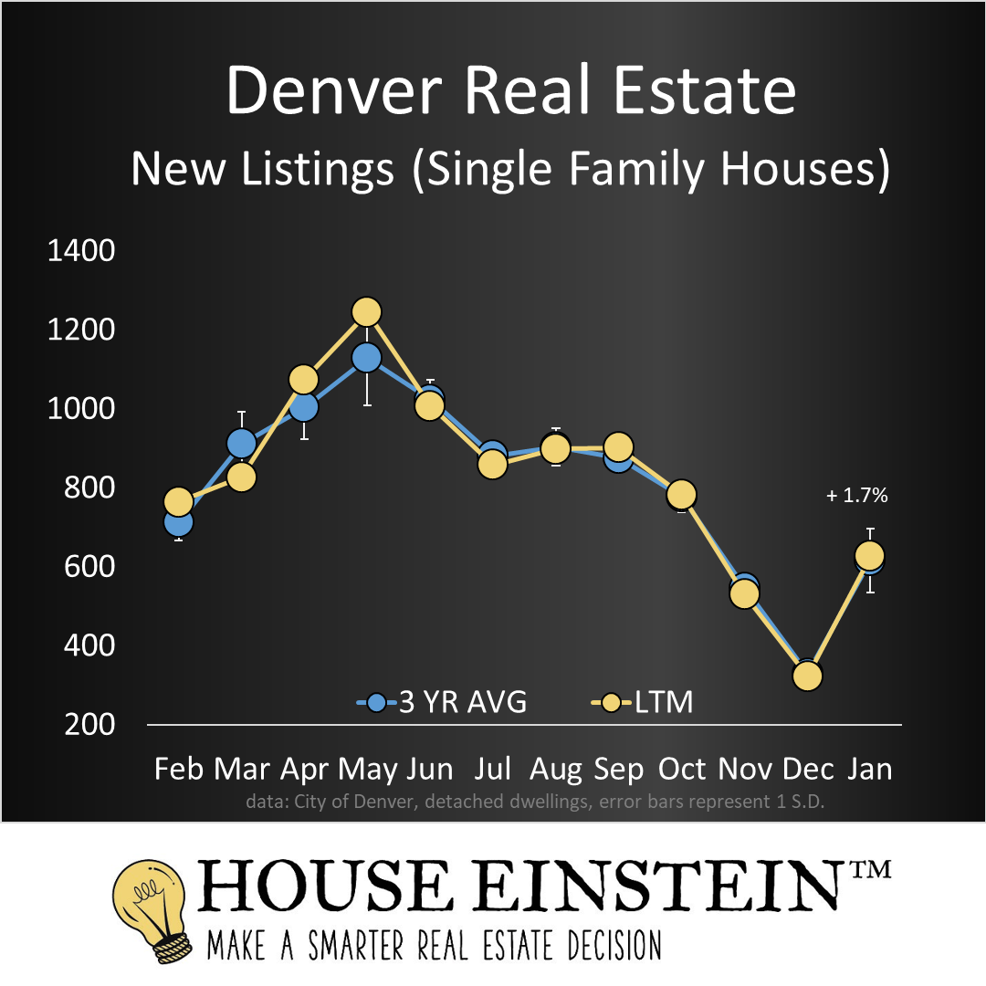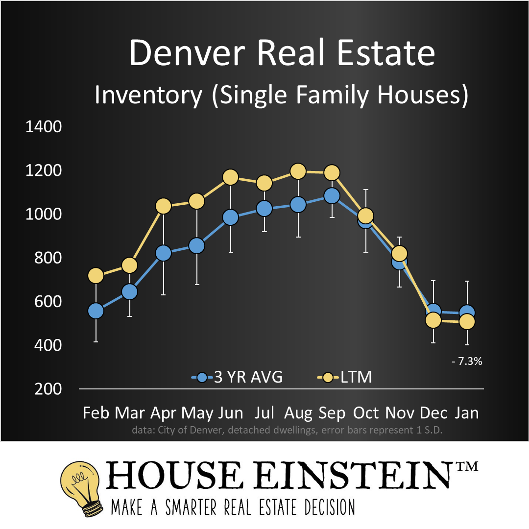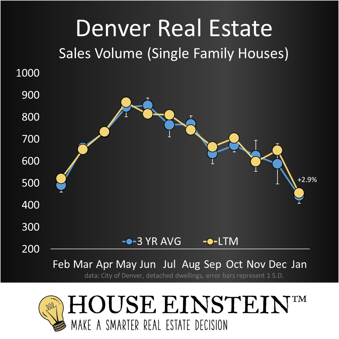 455 homes sold last month in the City of Denver, 2.9% above average for January and up 10.7%, year over year.