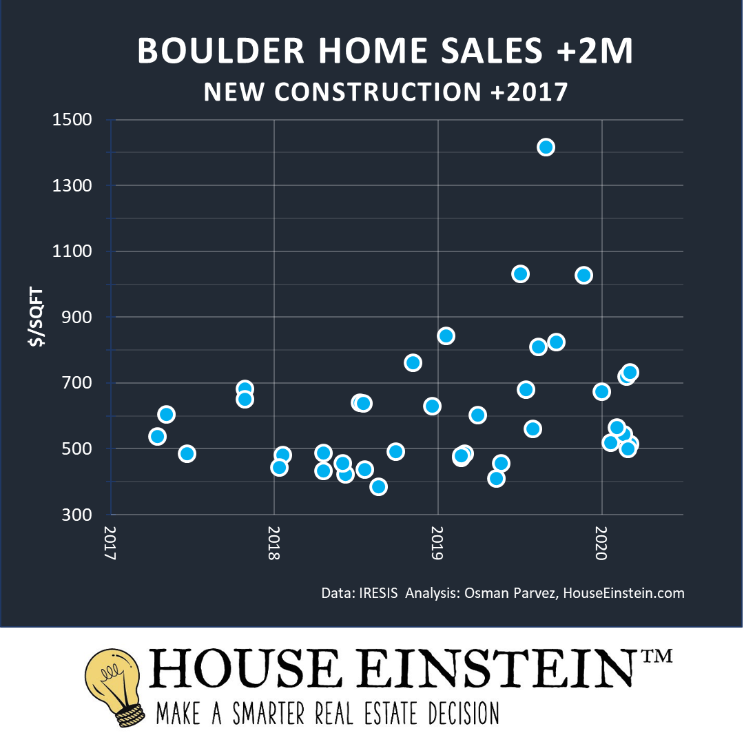 This scatter plots represents $/SQFT for home sales in the City of Boulder valued at $2M or more, built after 2017.