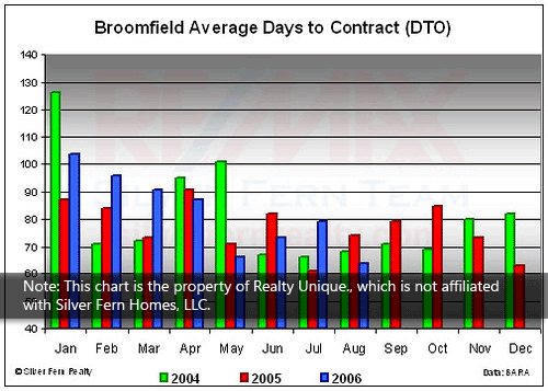 In summary, inventory is up substantially in Broomfield but for the last few months, days to offer has been flying below last year (except July). As with other markets showing lower days to offer but higher inventory, this suggests that hesitant or marginal buyers are out of the market. Meanwhile sales volume is essentially unchanged from 2005 and running ahead of 2004 (~11% more sales).