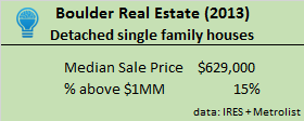 The median sale price in Boulder during 2013 was $629,000. By definition, half of the sold homes in Boulder fell below this level. $1MM+ sales represent only 15% of the market. $2MM+ sales are an even small slice of the pie, only 3%.