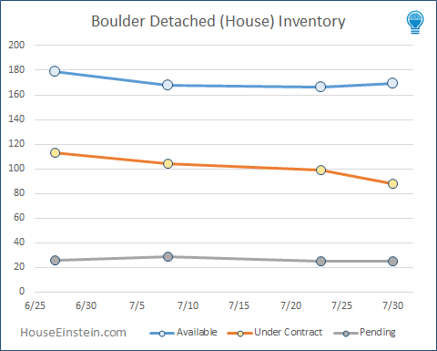 The chart above shows attached dwelling inventory (i.e. town homes and condos) in the City of Boulder from the end of June through today, July 30. The blue line is available, the orange line is under contract, and the grey line is pending.