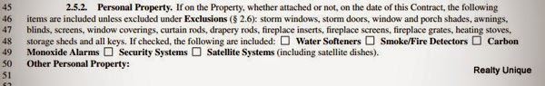 I read §2.5.2 out loud. “Personal Property. If on the Property, whether attached or not, on the date of this Contract, the following items are included unless excluded under Exclusions (§ 2.6): storm windows, storm doors, window and porch shades, awnings, blinds, screens, window coverings, curtain rods, drapery rods, fireplace inserts, fireplace screens, fireplace grates, heating stoves, storage sheds, and all keys. (emphasis mine)