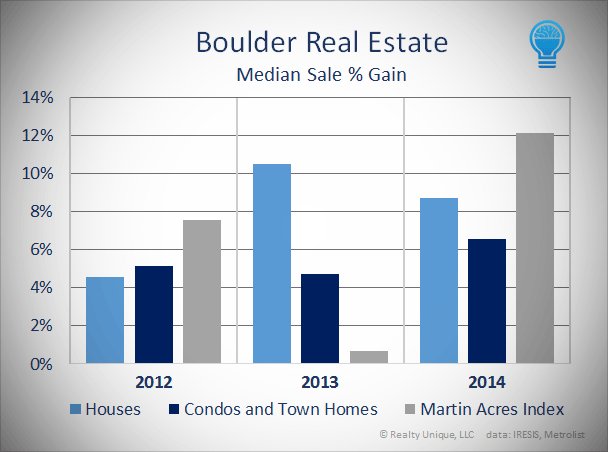 Houses posted three solid years of gains in Boulder. Condos out performed in 2012 but trailed houses in 2013 before gaining some ground in 2014. The benchmark MAI saw strong gain in 2012, was relatively flat in 2013, and then screamed ahead in 2014.