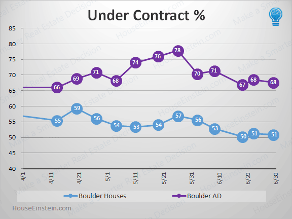 Percentage of inventory under contract peaked near the end of May, dropping from 78% to 68% for attached dwellings. For houses, its dropped from 57% to 51%. This is a good proxy for competition among buyers for available properties.