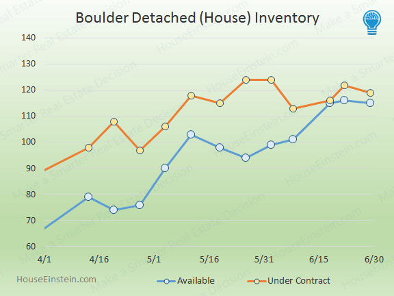 115 houses are currently available, 119 are under contract and headed to closing. This represents a 26% decrease in total inventory compared to a year ago, respectively. We’re now in the 6th consecutive summer of declining inventory in Boulder.