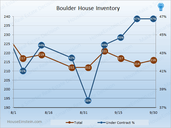 This first chart (above) shows inventory for Boulder houses. The brown line represents the total number of houses listed in inventory. The blue is the percentage that are currently under contract.