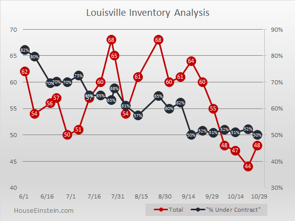 The red line is the total inventory in Louisville. The dark blue line is the percentage of inventory under contract. The chart goes back to June.