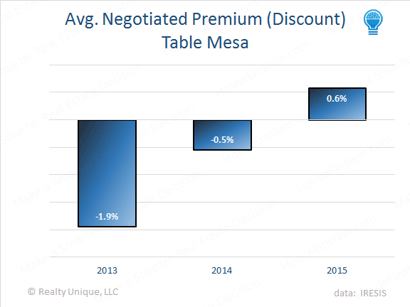 Last year, houses in Table Mesa traded at an average premium of 0.6%. Contrast that with an average negotiated discount of 1.9% in 2013.