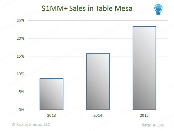 The median sale price in Table Mesa rose from $600,000 in 2013 to $730,000 in 2015, an increase of 21.6% in two years. 2015 showed a stronger appreciation rate (11.5%) than the previous year (9.1%).