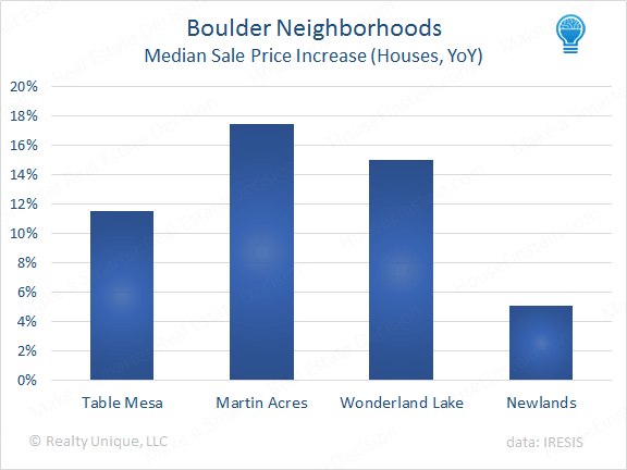 As it turns out, Martin Acres experienced far higher appreciation last year than many Boulder neighborhoods including Table Mesa, Wonderland Lake, and Newlands. The median sold price for a house in Martin Acres increased 17.4%. Wonderland Lake increased 15%, and Table Mesa 11.5%. Newlands, by comparison, gained a paltry 5.1%.