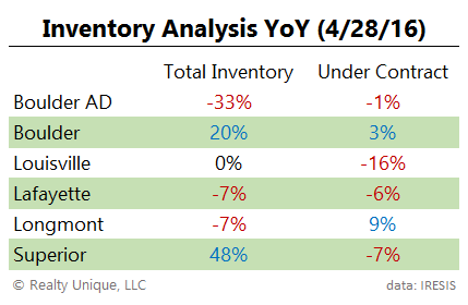 Here’s our latest inventory analysis for Boulder real estate markets compared to last year.