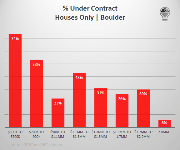 Take a look at the chart below. It shows percentage of inventory under contract in Boulder in mid February, segmented into price tranches. Demand is much higher for houses in the $500,000 to $700,000 range compared to higher price points. Meanwhile, only a small fraction of the high-end is under contract. Does that tell you something? It should.