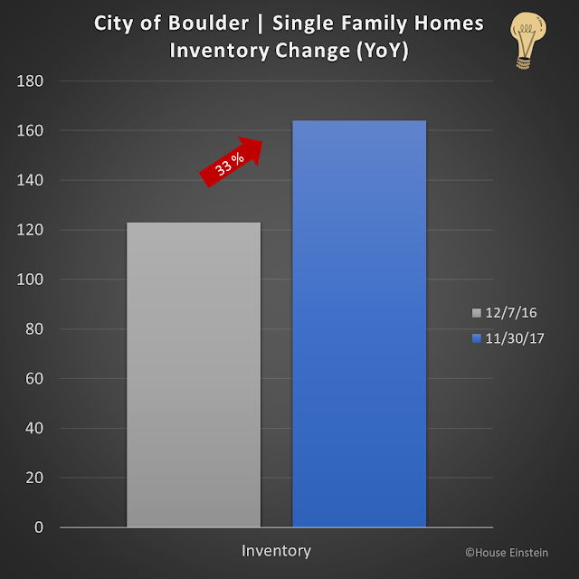 As noted in previous blog posts, the Boulder market continues to show signs of slowing. The chart below shows inventory for detached, single family houses, year over year. Inventory of these homes is up 33%.