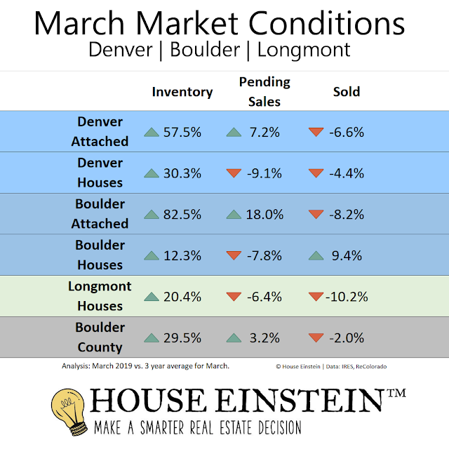 Last week, I completed House Einstein’s analysis of first quarter real estate market conditions in Boulder, Longmont, and Denver. You’ll find charts showing inventory, sales volume, and pending sales published across our social feeds on Insta, Facebook, and Twitter.