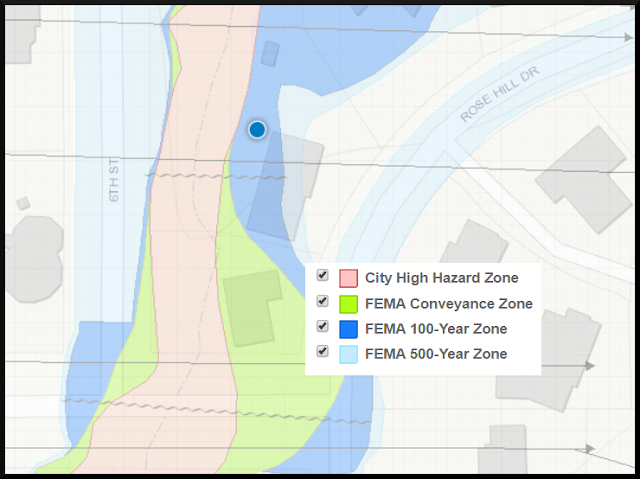 Due diligence: Although it supposedly didn’t receive any damage during the September ’13 event, this house is directly adjacent to Gregory Creek and in the 100 year flood plain. The house directly south appears to be in the conveyance zone (see map below).