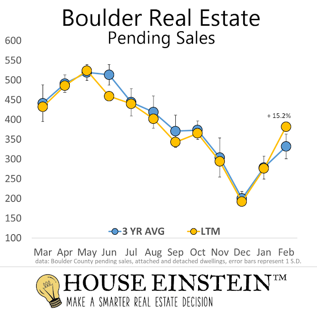 I’ve been crunching the latest data on real estate conditions in Boulder. It paints an interesting picture. Inventory continues to build, as expected, but pending sales spiked dramatically upwards in February.