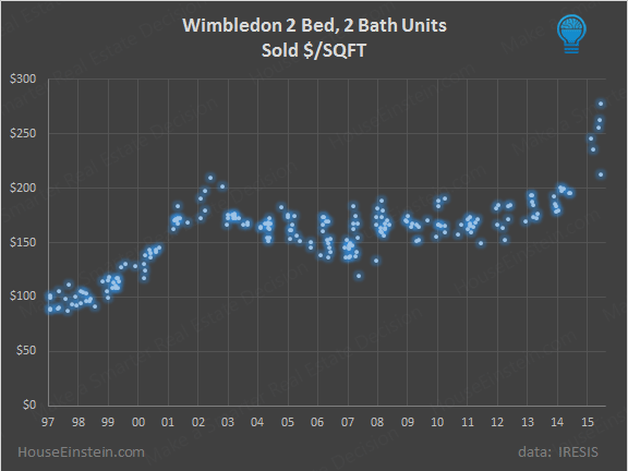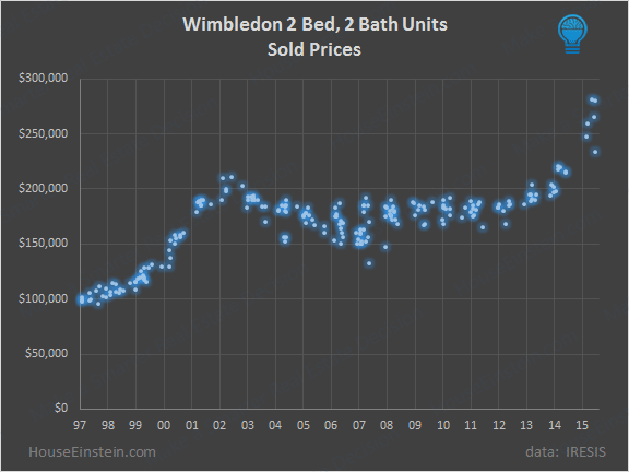 This chart shows sold prices for 2 bed, 2 bath units dating back to 1997. You can see the run-up in prices corresponding to the dot-com bubble. Prices dropped from 2002 to 2005, and then more or less skidded sideways until about 2013.