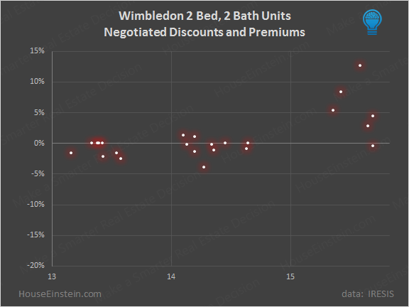 This next chart is a narrower focus on just the last few years. During 2014, a couple of units traded at premiums to asking while most sold for asking price or at a small discount.   In 2015, the majority obtained a premium to asking.