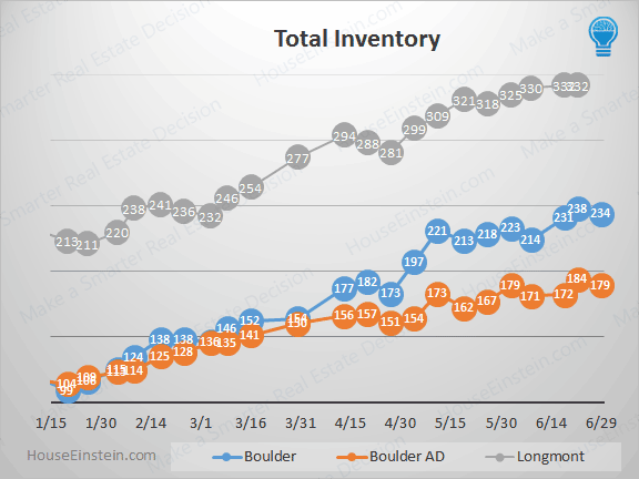 This chart shows growth in total inventory (available and under contract) since the beginning of the year.   Longmont has the highest inventory, which reached a peak of about 330 houses.   234 Boulder houses are on the market.    179 town homes and condos (attached dwellings or AD).    In Boulder, condo inventory grew 14.7% since early April while house inventory grew at 32.2% over the same time period.