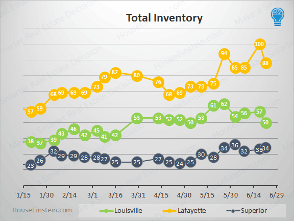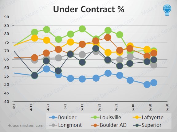 – At this time last year (left side), inventory under contract ranged from about 45% for Boulder to approaching 65% for Louisville.  This June, (right side of chart) it ranged from about 50% for Boulder to about 70% for Louisville.    This year has been a substantially stronger market.
