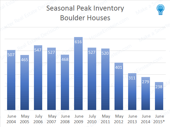 This final chart shows the historical peak for Boulder real estate (single family houses) going back to 2004.   This year is an estimate.    Inventory is down a massive 61.4% from June 2009.    This is the 6th consecutive year of declining inventory.